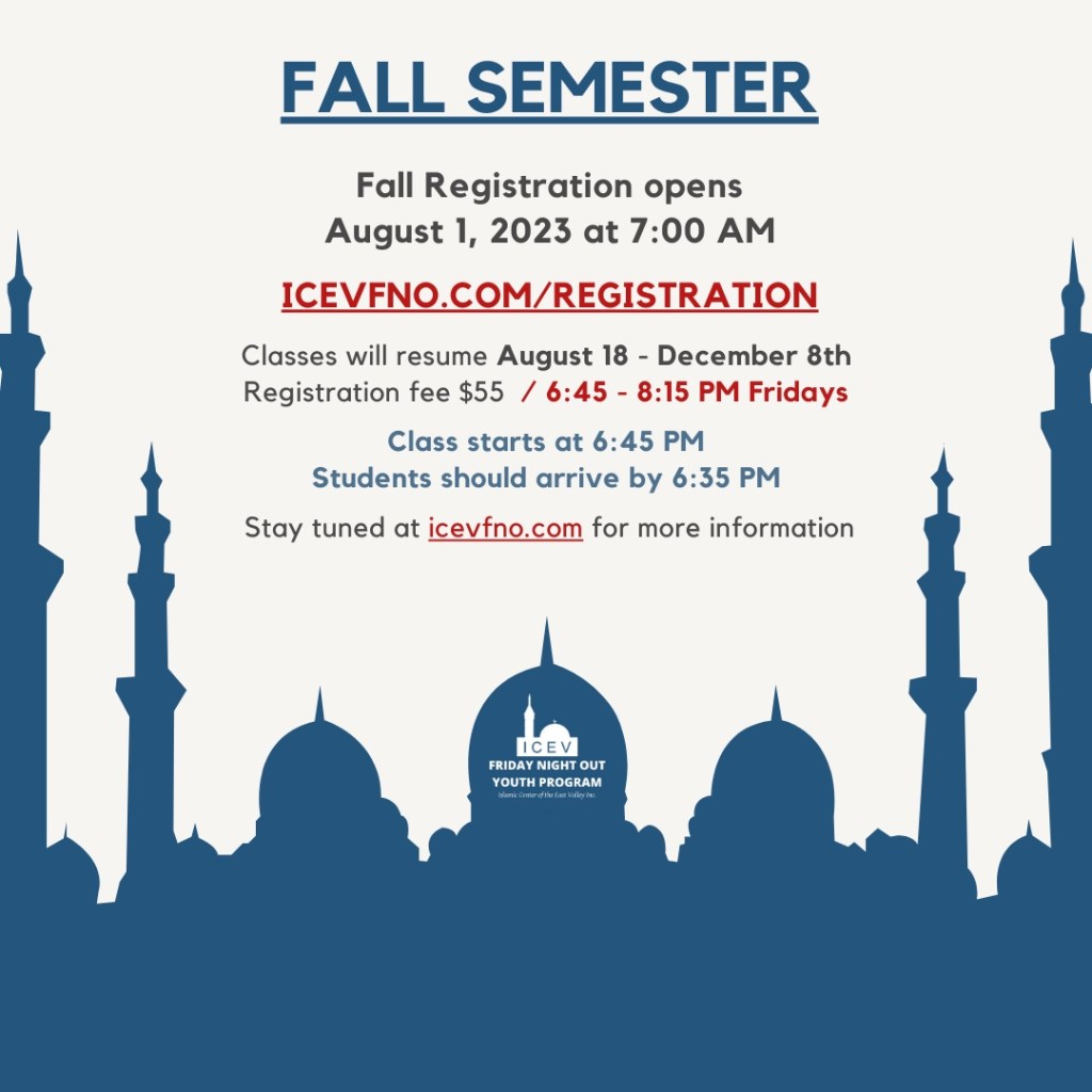 FNO Fall Semester 2023 July 24, 2023August 2, 2023 fnostaff Uncategorized Assalamu Alaikum Dear Parents & Students: Click here to go to registration page. Share this: Click to share on Facebook (Opens in new window) Facebook Click to share on X (Opens in new window) X Click to email a link to a friend (Opens in new window) Email Click to print (Opens in new window) Print