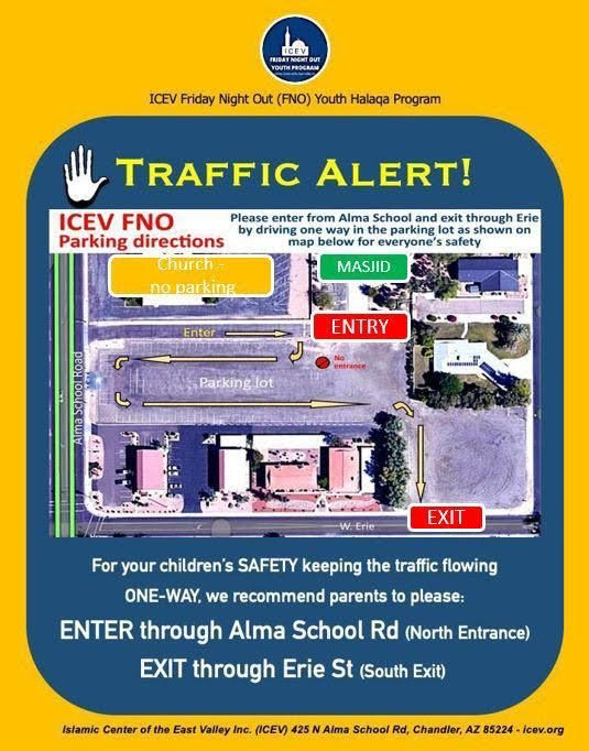 - Parking Etiquette: For everyone’s safety you are requested to enter the dirt parking lot from Alma School Road (the Masjid Driveway from Alma School). Once you enter the parking lot, please park the car in an orderly fashion such that you are not blocking the passageway or any other properly parked cars. Please, please do not DRIVE AGGRESSIVELY no matter how late you are in the parking lot. Exit from the south side of the parking lot on Erie Street. PLEASE DO NOT EXIT from the north side entrance towards Alma School Road. We have some safety patrol volunteers helping with the traffic in the parking lot. Please obey their instructions as they are doing their job. For your convenience, a parking map with directions is attached BELOW to this message. Please take a moment to understand the requested traffic flow direction.